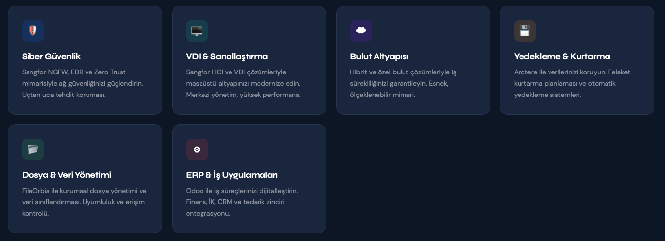 Sangfor, Arctera, FileOrbis ve Odoo iş ortaklarımızla; siber güvenlikten bulut altyapısına, veri yönetiminden ERP çözümlerine kadar kurumsal BT ihtiyaçlarınızı uçtan uca karşılıyoruz. Güvenli, ölçeklenebilir ve sürdürülebilir bir dijital gelecek için yanınızdayız.